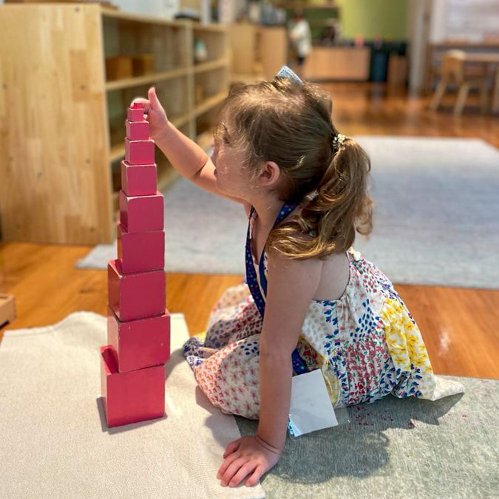 Montessori materials help students work through topics themselves. All “work” is designed to be visually appealing, sparking children’s natural curiosity. Specially designed hands-on materials isolate specific concepts, such as weight, color, and height, and allow children to focus on one skill at a time. Children learn through practice and repetition with these manipulatives, and they develop a concrete understanding before moving to more abstract work.